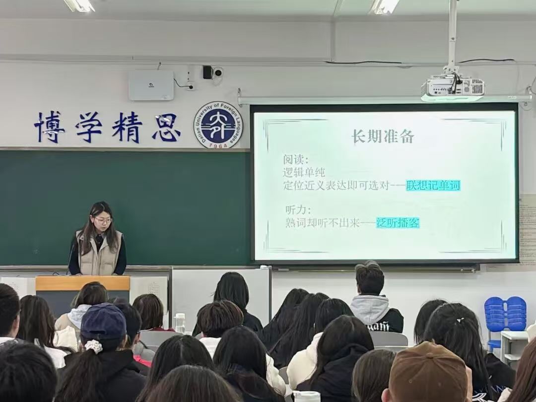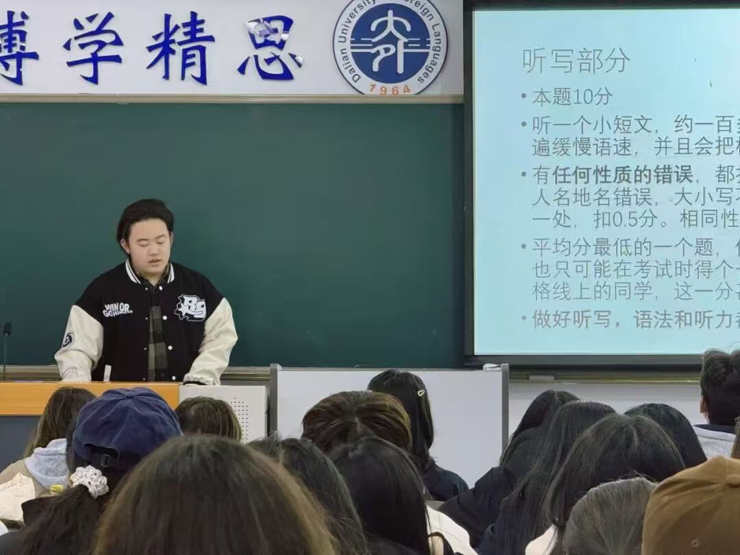 任鸿博同学介绍了整个法语考试体系以及法语专四的考试内容和题型,分享了阅读、写作和听力听写的做题方法,并推荐了《法语现代语法》等对法语学习非常有帮助的书籍,为同学们的备考提供了宝贵的参考。