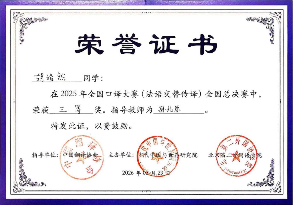 胡皓然凭借扎实的专业功底与稳定的赛场发挥,荣获法语交替传译组三等奖。